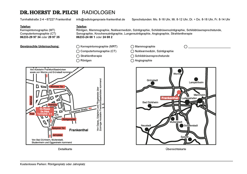Wir befinden uns in einem Ärztehaus mit mehreren Fachärzten. Parkmöglichkeiten finden Sie am Röntgenplatz, am Jahnplatz und im nahegelegenen Parkhaus. Anbei zwei Anfahrtsskizzen zu unserer Praxis in Frankenthal. Wenn Sie das Bild anklicken können Sie die Zeichung herunterladen und danach ausdrucken.
